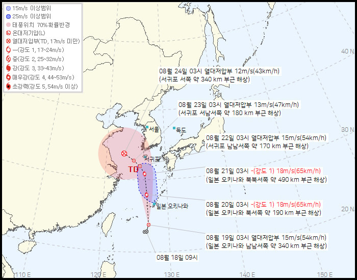 - 일본 기상청: 큐슈 인근 북상 → 제주 남쪽 간접 영향